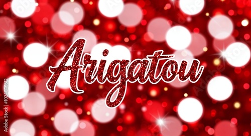 arigatou calligraphic lettering on red bokeh glitter festive sparkles background
