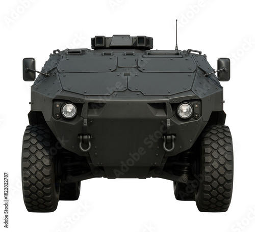 Armored wheeled transporter featuring modular armor and spotlight system.