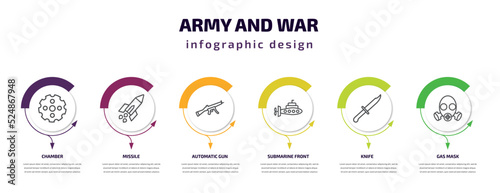 army and war infographic template with icons and 6 step or option. army and war icons such as chamber, missile, automatic gun, submarine front view, knife, gas mask vector. can be used for banner,
