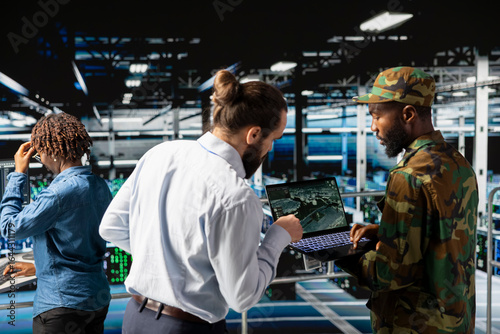 Army technicians using laptop to install server security systems in command center server farm. Military data center engineer and soldier overseeing computer networks for hybrid warfare.