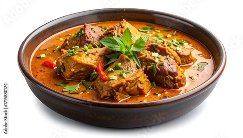 Aromatic curry dish with tender chunks of meat in a rich, brown bowl, garnished with fresh herbs and spices.