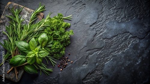 Aromatic Green Herbs and Peppercorns on a Rough Black Surface