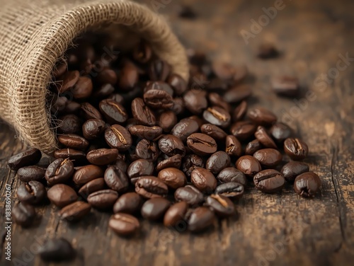 Aromatic roasted coffee beans spilling from a burlap sack on wooden table