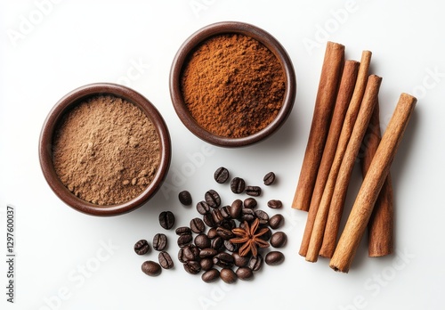 Aromatic Spices and Coffee Ingredients on a Clean White Surface Featuring Cinnamon, Ground Coffee, and Coffee Beans for Culinary Inspiration