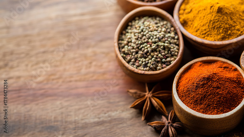 Aromatic spices and herbs for culinary adventures. Vibrant turmeric, paprika, peppercorns, and star anise showcased in rustic wooden bowls on a warm wooden surface.