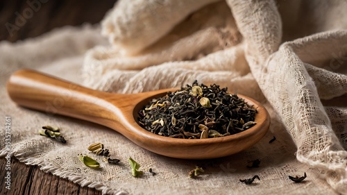 Aromatic Tea Blend Dispersed on Muslin Cloth Beside Wooden Scoop