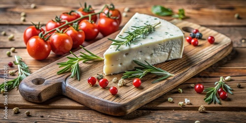 Aromatic Wedge of Cheese with Herbs and Berries on Rustic Wooden Board