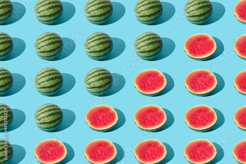 Arranged watermelon and the half on a blue pastel background. Minimal pattern and design.