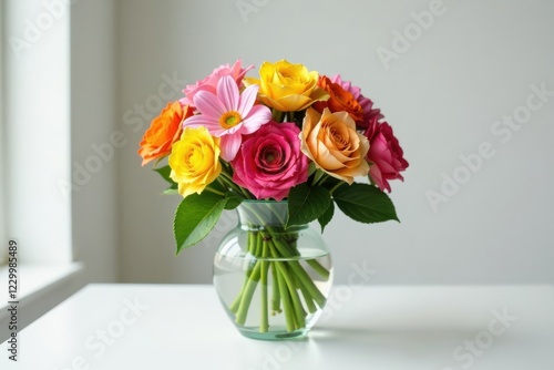 Arrangement of colorful blooms in a vase on a clean white table , flowers, vase, white