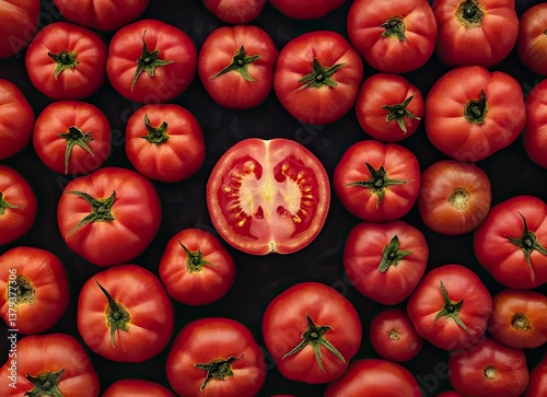 Arrangement of Fresh Red Tomatoes with One Cut Tomato Overhead View