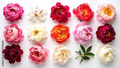 Array of colorful peony blooms and a single green leaf on a clean white background, flat lay