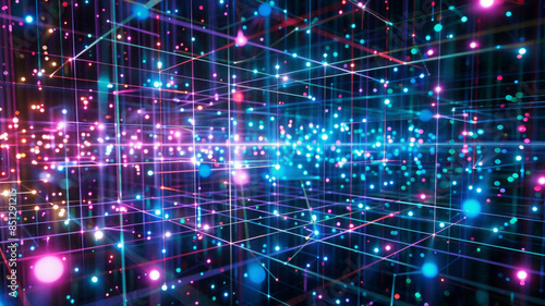 Array of interconnected devices arranged in a grid pattern, emitting vibrant, pulsating lights against a dark, futuristic background