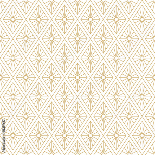 Art Deco seamless pattern features golden geometric diamond shapes with radiating sunbursts on transparent background, perfect for elegant designs.