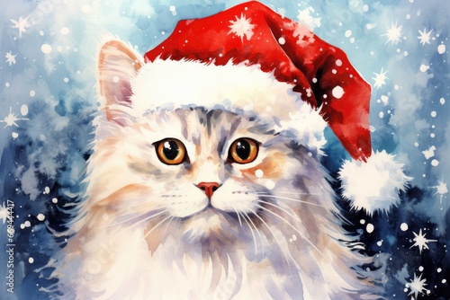 Art Portrait of Happy Cat animal with a red and white santa hat, Christmas scene, Winter holidays, snow background, collection Christmas animals. Front view. Generative AI