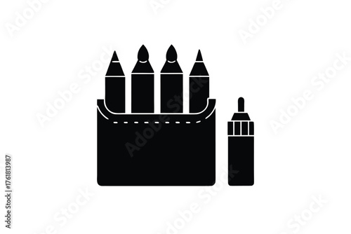 Art supplies silhouette: pencils, brushes, bottle for creative use