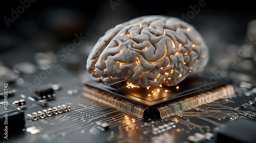 Artificial intelligence brain model glowing with energy atop a complex computer circuit board