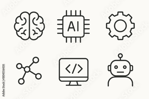 Artificial intelligence icons: brain, ai chip, gear, network, code, robot outline