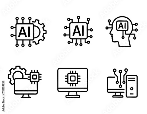 Artificial intelligence icons set. AI chip, brain, computer and machine learning symbols