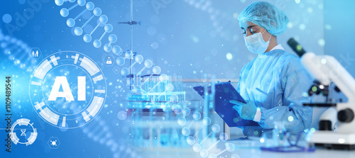 Artificial intelligence in medicine. Laboratory worker and illustrations of DNA, double exposure. Banner design