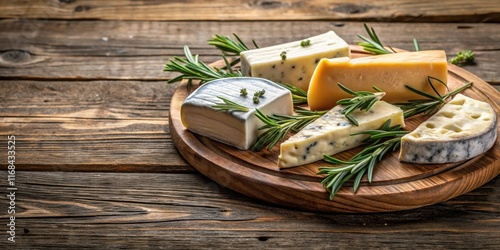 Artisanal cheese platter garnished with fresh rosemary sprigs and served on a rustic wooden board , food, artisanal