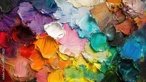Artist palette smeared with a mix of vibrant paint colors, showing the creative process in action.