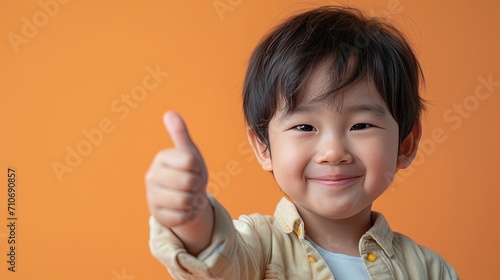 Asian 8 years old boy happily smiles and shows thumbs up