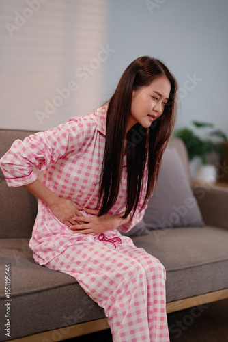 Asian Adult Woman Experiencing Severe Abdominal Pain While Sitting on Sofa at Home Suffering from Discomfort Health Illness