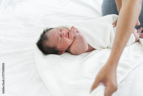 Asian Australian Newborn baby girl wrapping in white towel after bath with mother hands. 19 days infant crying lying on bed at home