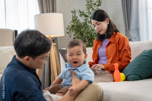 Asian baby and families who have to work while raising children at home