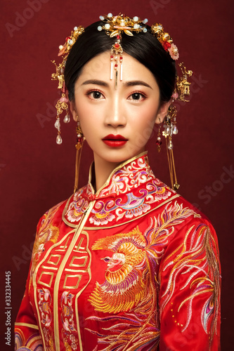 Asian brides in red wedding vintage dress on red background