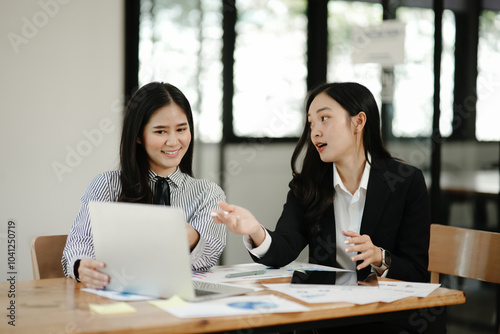 Asian business woman talking, working on graph documents