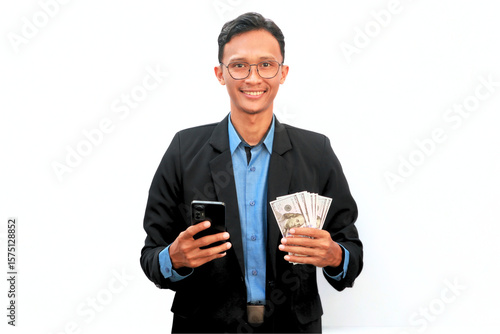 Asian businessman holding cellphone and dollar bill with happy expression