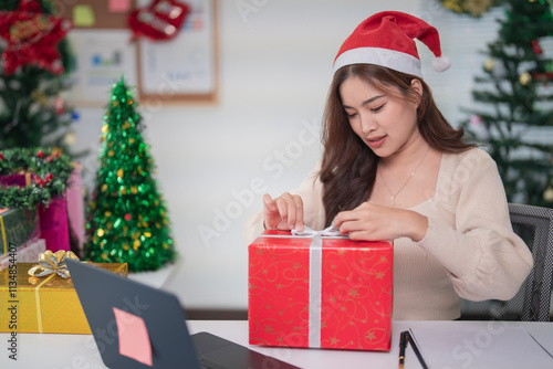 Asian businesswoman wearing a santa hat, joyfully opening a christmas gift while seated at her desk in an office adorned with festive holiday decorations, celebrating the season