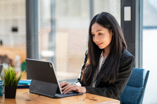 Asian businesswoman working on a tablet with documents at the desk in the office.