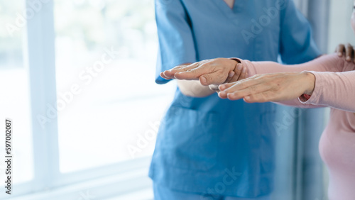 Asian Chinese female physiotherapist caregiver helping elderly woman exercise for recovery, prevention of osteoarthritis and osteoporosis.