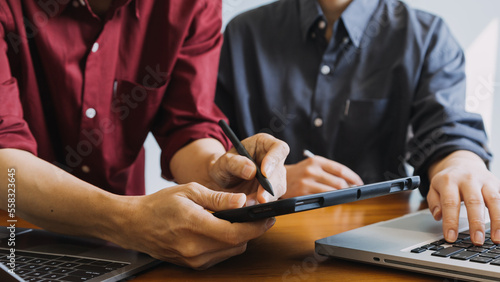 Asian colleagues man and woman discussing and working with laptop computer on office desk in the office