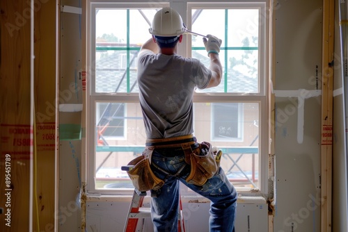 Asian construction worker installing windows, completing finishing touches, Generative AI