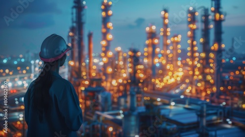 Asian engineer smart city smart industry background, sustainable power saving energy management smart factory technology, oil and gas plant background