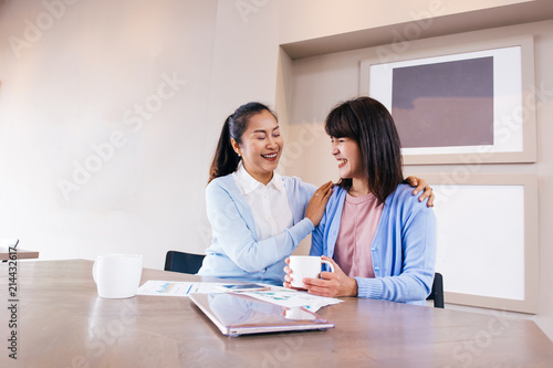 Asian family of middle aged woman and young teenage daughter talking and smiling at cafe restaurant