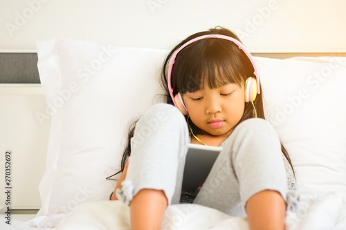 Asian girl wearing headphones Watching happy video clips, lifestyle Children's digital age