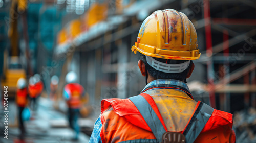 Asian man facing backwards and working in a construction site wearing the yellow helmet