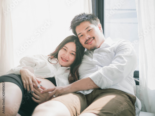 Asian man husband take care of his pregnant wife.Beautiful pregnant woman and her handsome husband are smiling while spending time together.