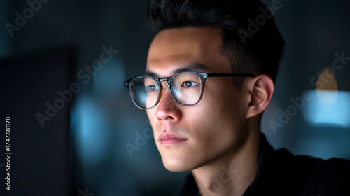 Asian man is intently focused on something, wearing glasses and a focused expression. The subtle lighting heightens the mood, drawing focus to his concentrated gaze