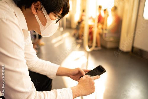 Asian man wearing surgical face mask using smartphone on skytrain or urban train. Coronavirus (COVID-19) outbreak prevention in public transportation. Health awareness for pandemic protection