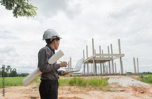 Asian manager in white helmet safety standing holding pen and blueprint of engineer architect on site checking project structure with cement posts, construction of a plan new house on laptop