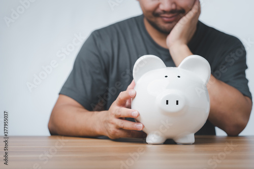Asian men are thinking about what to do with their savings. Bearded man Happily sitting looking at the piggy bank