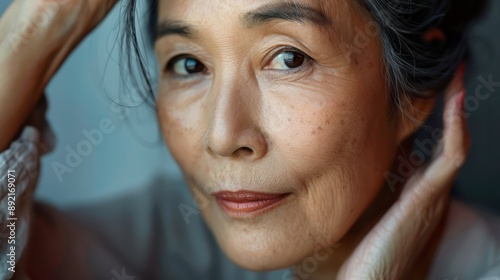 Asian old woman face portrait with young smooth looking skin. 50 years Asian Korean or Chinese woman portrait with hand in hair for healthy skin advertising of skincare cosmetics
