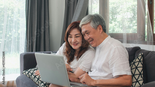 Asian senior couple using laptop at home. Asian Senior Chinese grandparents, surf the Internet to check social media while lying on sofa in living room at home concept.