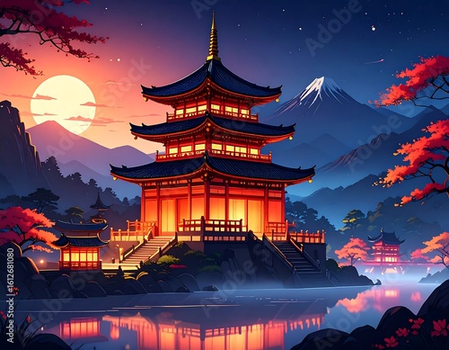 Asian temple at night by a lake
