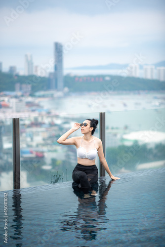 Asian travel concept. young woman enjoying with the city sky view from hotel roof top swimming pool, beautiful girl lifestyle outdoor in vacation time